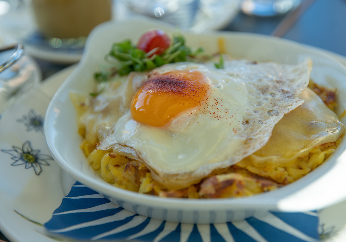 Thinly grated potatoes, pan-fried until crisp and golden, rosti is one of Switzerland’s iconic national dishes. Served steaming in a ceramic dish, Rosti Valaisanne is a delightfully addictive mash-up of rosti topped with salty bacon, fried egg, and melted raclette cheese, served alongside tangy gherkins and pickled pearl onions.